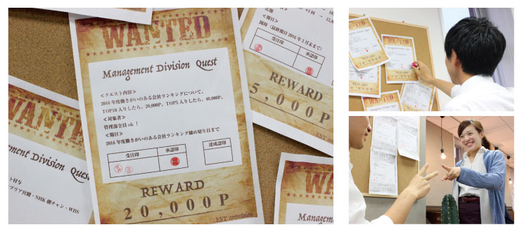 医療・福祉ITベンチャーの株式会社エストコーポレーション(本社:東京都千代田区、代表取締役:清水史浩)は、成長意欲のある社員を対象に、“つかみどり業務”制度となる新たな社内制度「エストクエスト制度」を、2015年6月24日より開始しました。手配書をモチーフにしたクエストが社内に掲示され、挑戦した社員は報酬を得ることが出来ます。