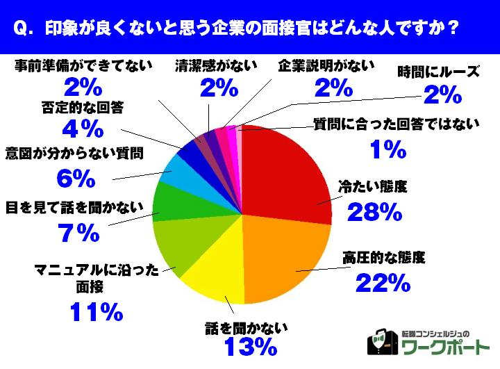 総合【転職希望者のホンネ調査】 面接官必見!会社のイメージ・志望度までも左右する面接官の印象。 好感がもてないのは『冷たい態度』や『高圧的な態度』。