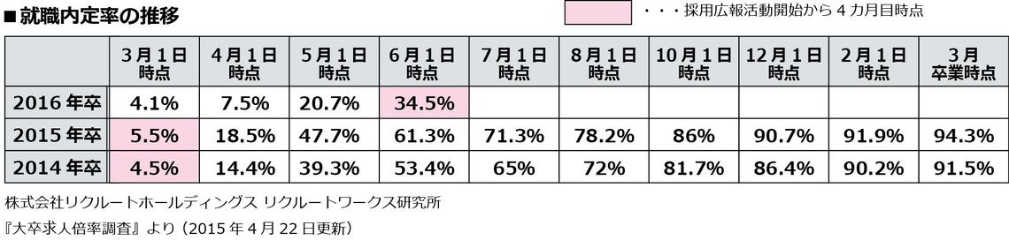 これを加工して比較してみると、2014年度、2015年度は採用広報活動開始が12月1日だった。この調査は3月1日時点のデータから集計している。3月1日は4カ月目ということになる。採用広報活動開始から4カ月目時点の比較をすると、ここでの就職内定率は2014年卒4.5%、2015年卒5.5%、2016年卒34.5%となっており、突出して高いことがわかる。