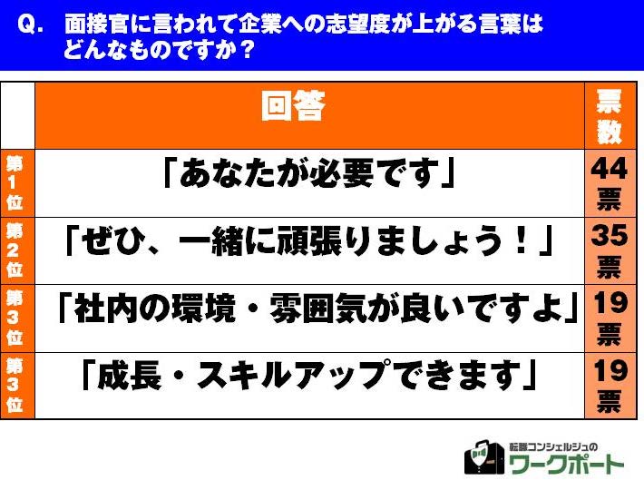 調査しました。様々なコメントが挙がりましたが、最も志望度が上がる言葉は「あなたが必要」(44 票)。