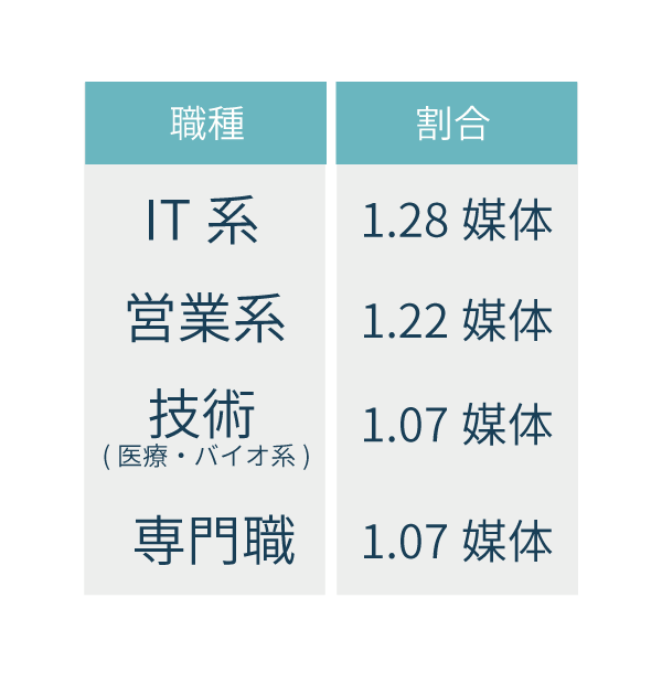 一方で、技術(医薬・バイオ)や専門職は単一媒体での掲載割合が高く、媒体の特性などを活かしながらピンポイントで活用してる状況が分かります。