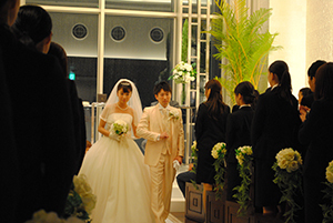 さらに都市型ブライダル事業を手がけるエスクリは、内定式において、74名の新入社員のうち代表の男女2名がウエディングの格好で登場するという試みを初めて行ったそうです。誓いの言葉は、神父ではなく役員に述べ、他の社員も列席して、内定者全員でキャンドルサービスをするなど独自の試みを行っています。