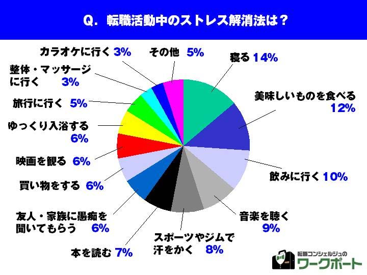 中途【転職希望者のホンネ調査】 転職活動中ストレス解消法は「寝る・食べる・飲む」! 「パソコン内のデータ整理をする」、「ゲームを作る」など個性的な回答も。