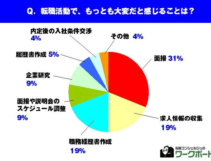 中途【転職希望者のホンネ調査】 転職希望者が、転職活動でもっとも大変だと感じること、 第1位は「面接」、次いで「求人情報の収集」、「職務経歴書作成」が同票。