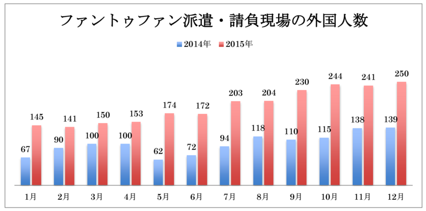 ファントゥファンは、千葉営業所を中心に食品関連工場など、東京営業所では小売現場などに派遣・請負で就労する外国人スタッフが2015年に入り、ほぼ毎月前年比倍増(※下グラフ参照/2015年12月数値は予測値)で推移するなど各企業の現場からの需要が高まっています。