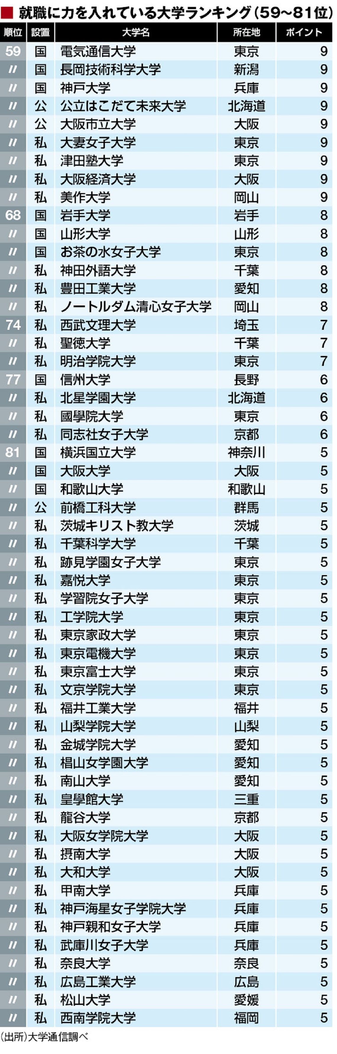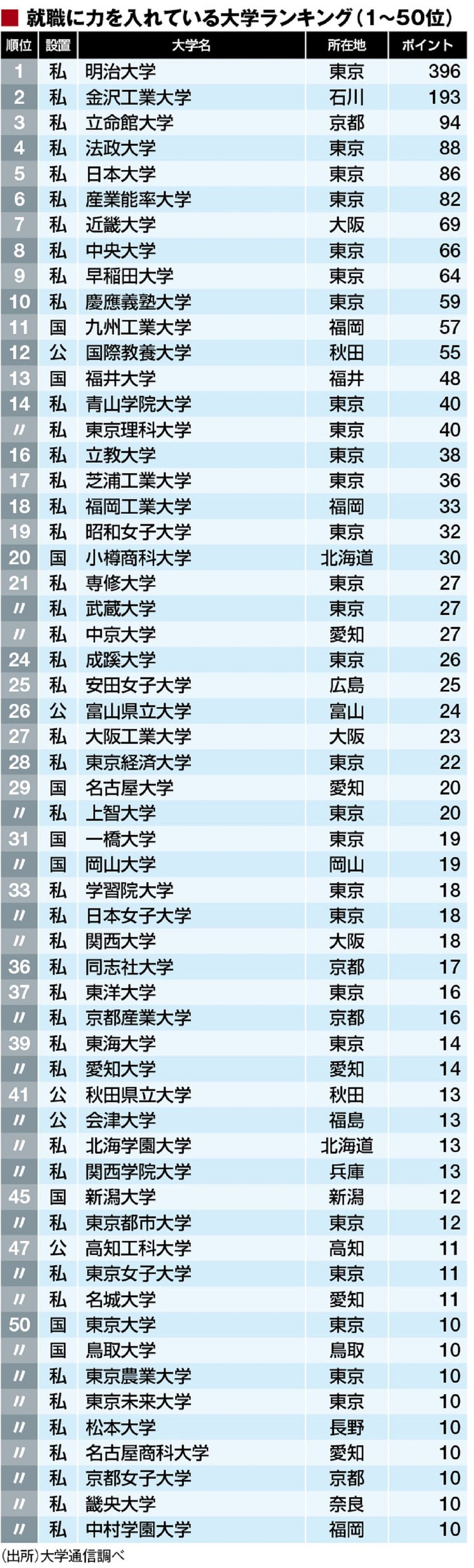 大学通信は毎年、全国約2000進学校の進路指導教諭にアンケート調査を実施し、今年も750校から回答を得た。「就職に力を入れている大学」はどこか、という質問に5校連記で大学を記入してもらい、いちばん最初に記した大学に5ポイント、次に4ポイント……として集計し、ランキング表にまとめた。