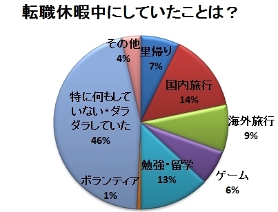 では、休みを取れた人たちはどのように転職休暇を過ごしていたのでしょうか。転職休暇を取れた人を対象に「転職休暇中にしていたこと」を尋ねたところ、最も多かったのはなんと「特に何もしていない・ダラダラしていた」という答えで、46%にも上る結果に。しかし残りの約半数は充実した日々を過ごしたようで、「国内旅行」(14%)、「海外旅行」(9%)、「里帰り」(7%)といった旅行を楽しむ人が3割、「勉強・留学」に勤しむ人も13%いることがわかりました。「ゲーム三昧」の日々を過ごした人もいたようです。