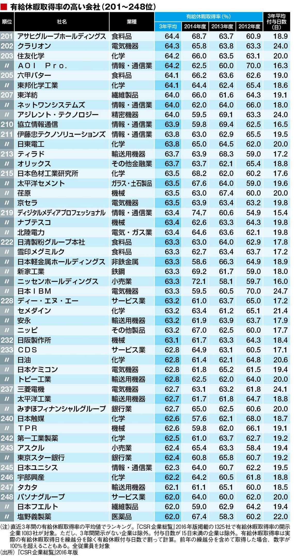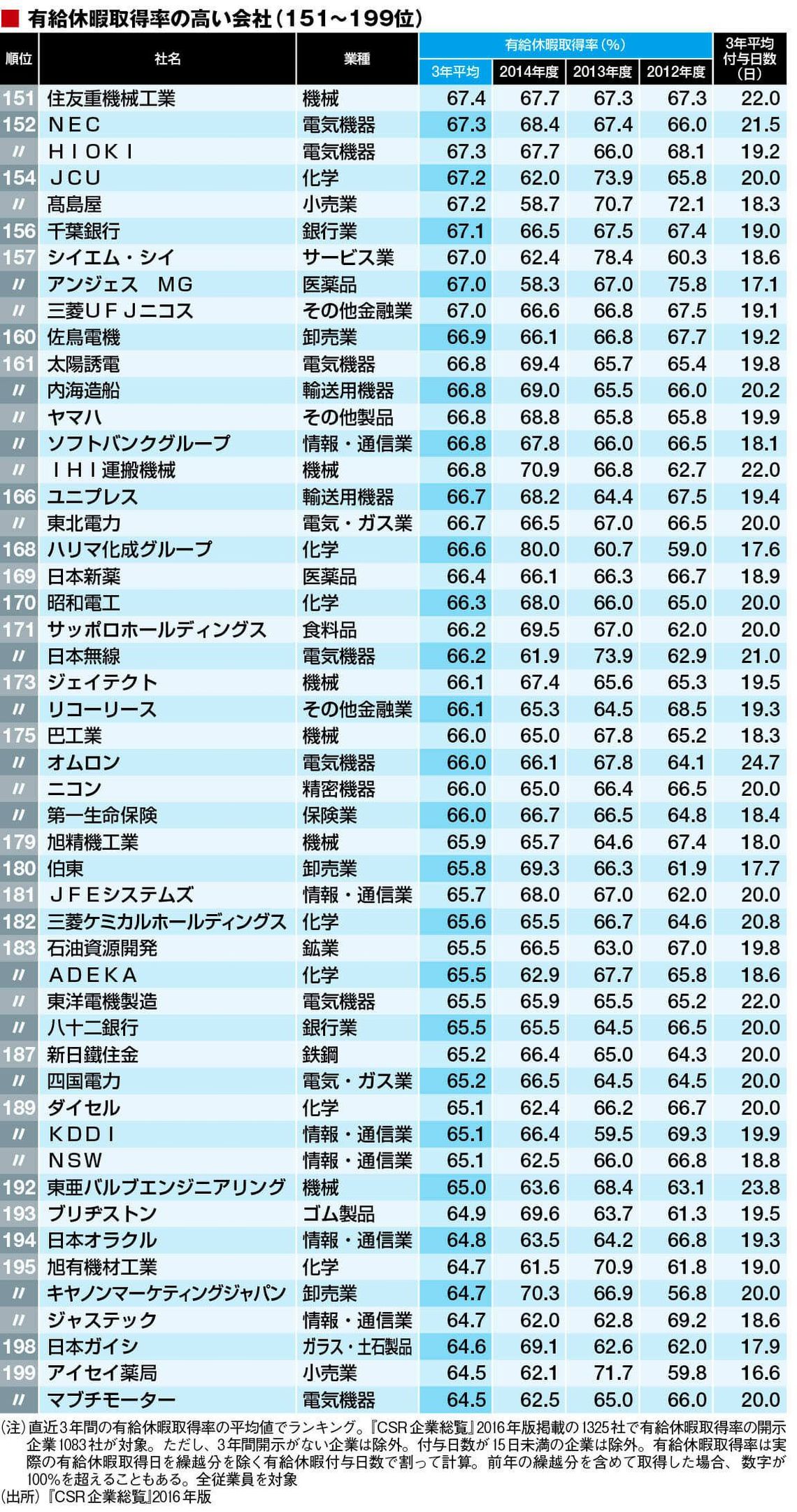 有給休暇は一般的に1年間に20日付与されるが、実際はそれ以上の会社も多い。たとえば、252位の中外製薬(61.6%)は全社員に有給の「フレックス休日」を通常とは別に4日与え、付与日数は3年とも26.4日と多い。取得日数は2012年度15.2日、2013年度16.2日、2014年度17.3日と上位企業と比べても決して悪くはないが付与日数が多いため取得率は高くない。