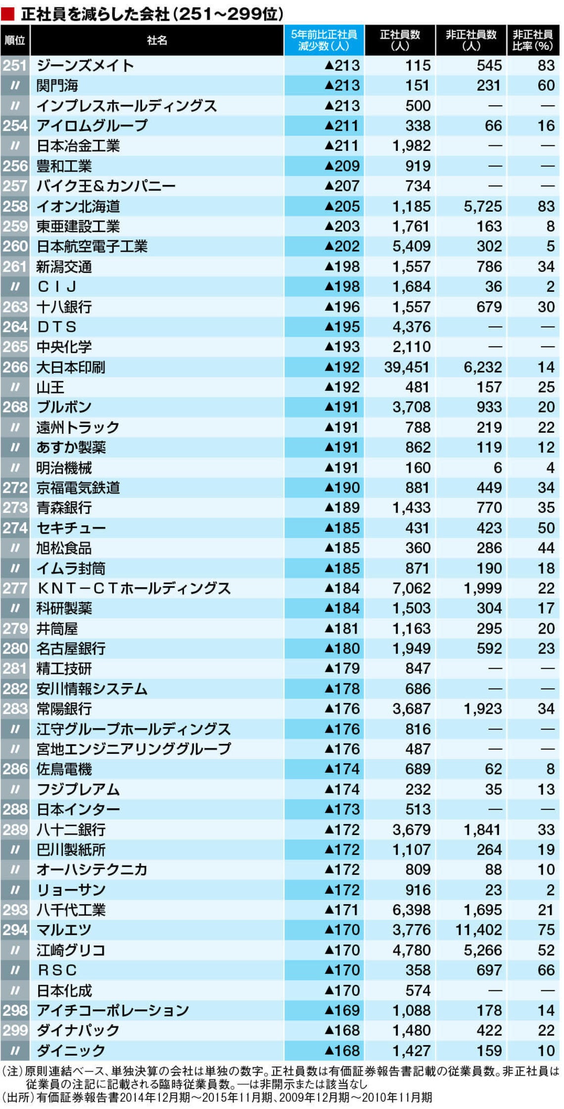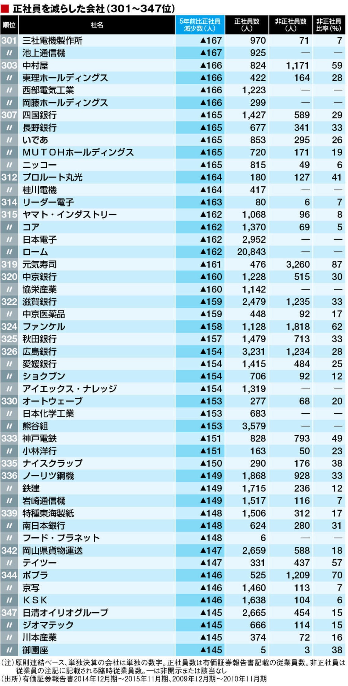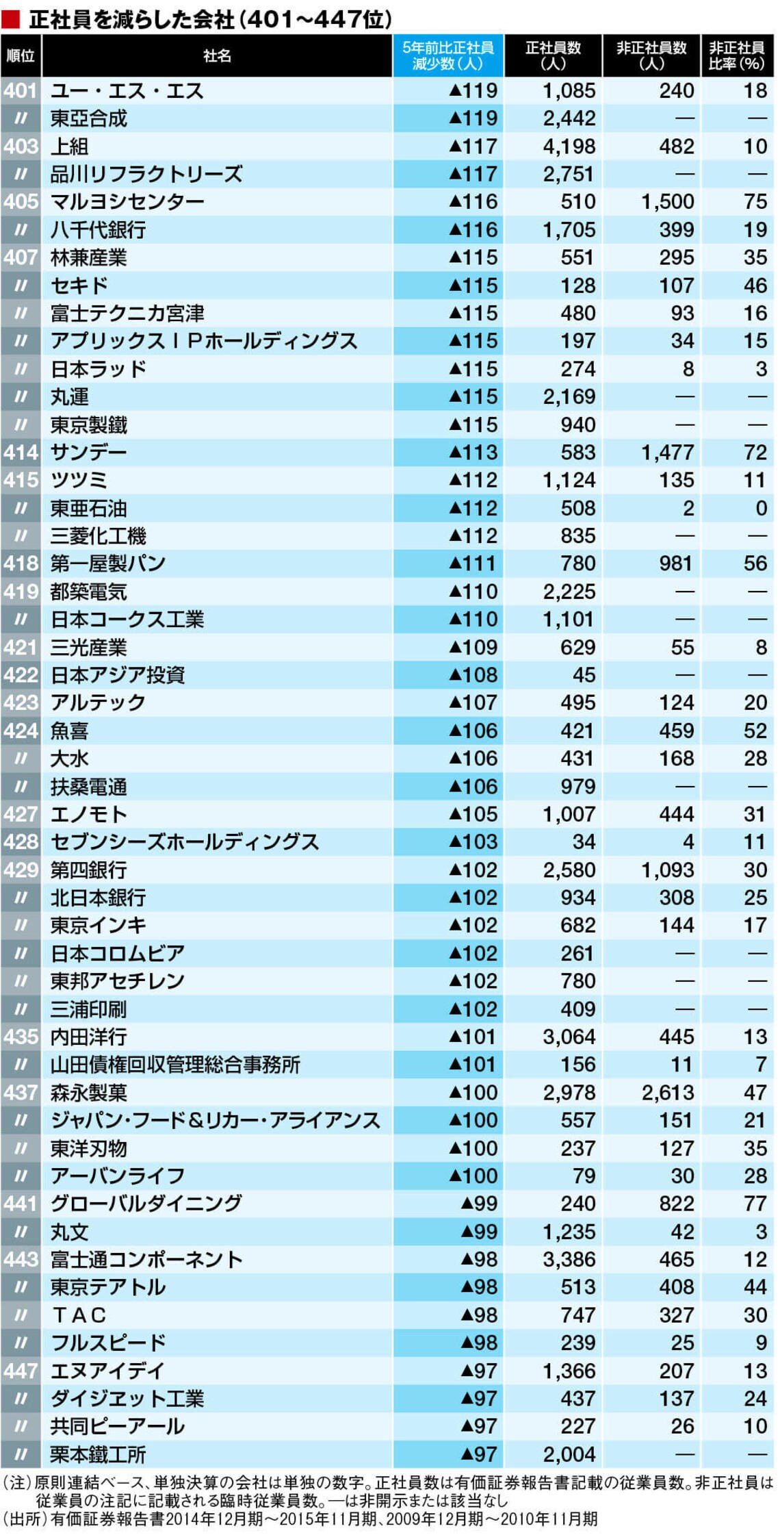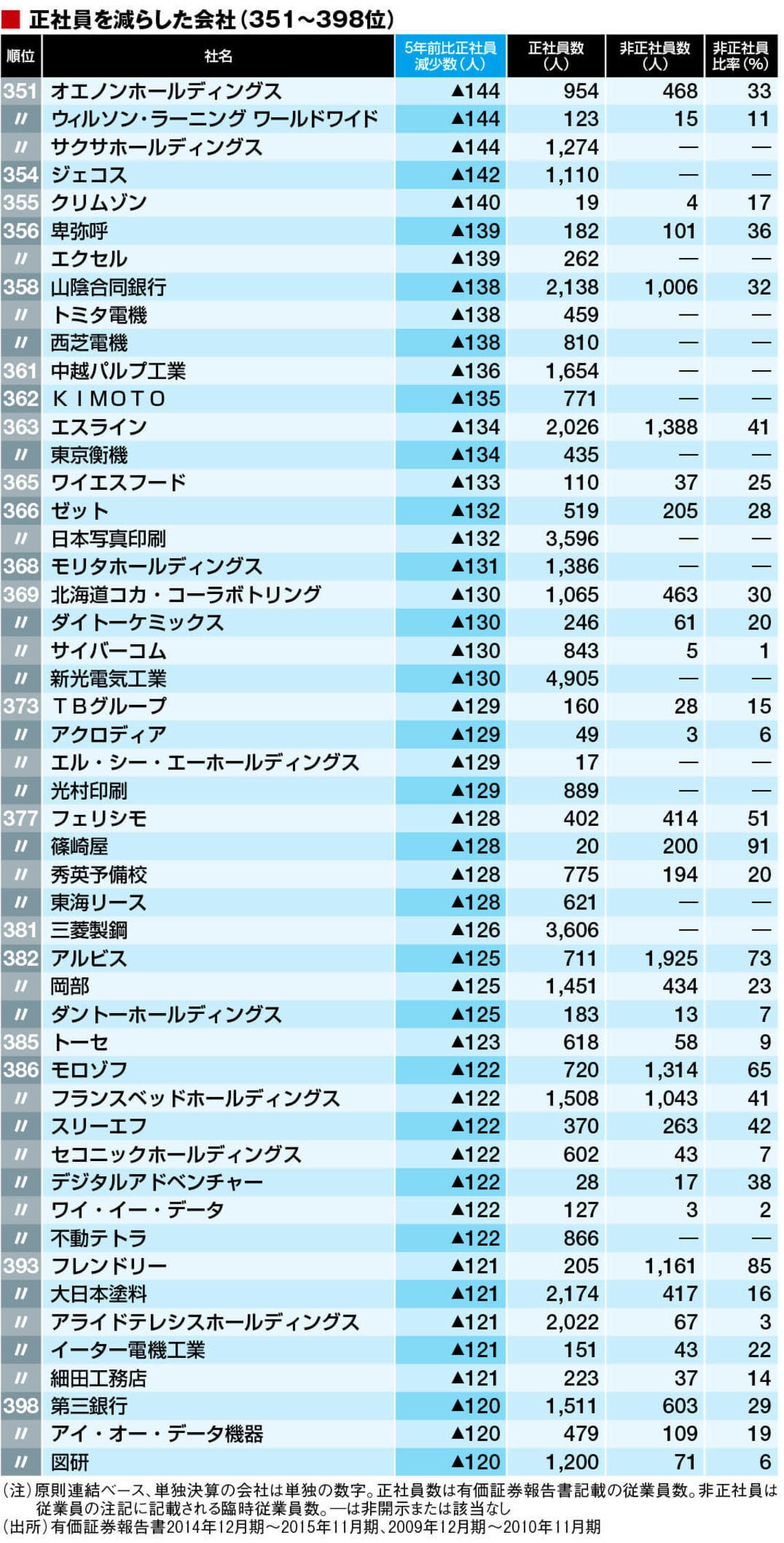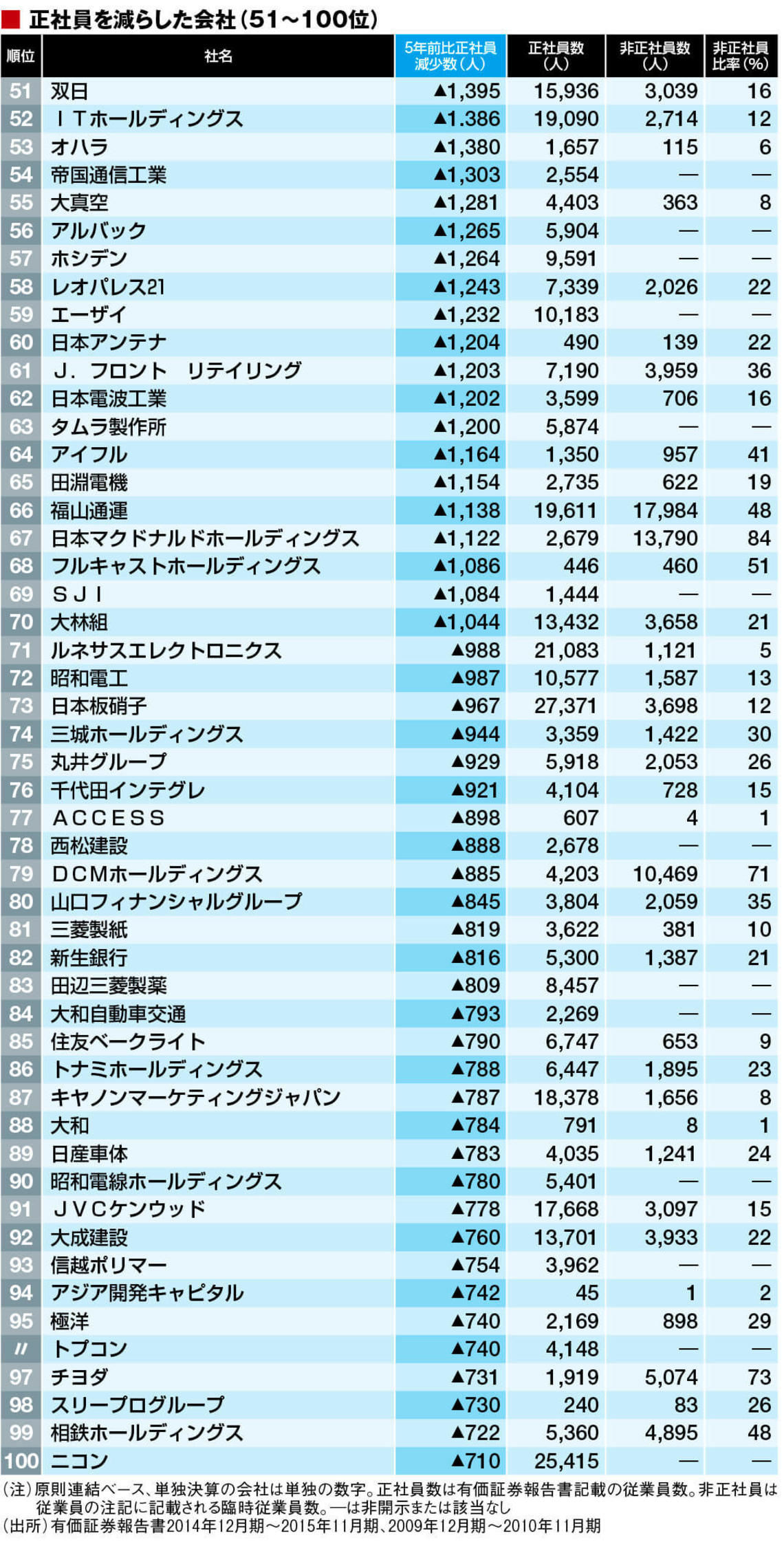 東洋経済オンラインは、過去5年で正社員を大きく減らした上場企業を独自に調査。上位500社をランキングした。雇用期間の定めがなく解雇にも厳しい制限などがある「正社員」は、有価証券報告書で原則は従業員数として記載されている。直近本決算(2014年12月~2015年11月期)と5年前で比較して、その減少数を調べた。昨年も同種のランキングを掲載したが最新版となる。