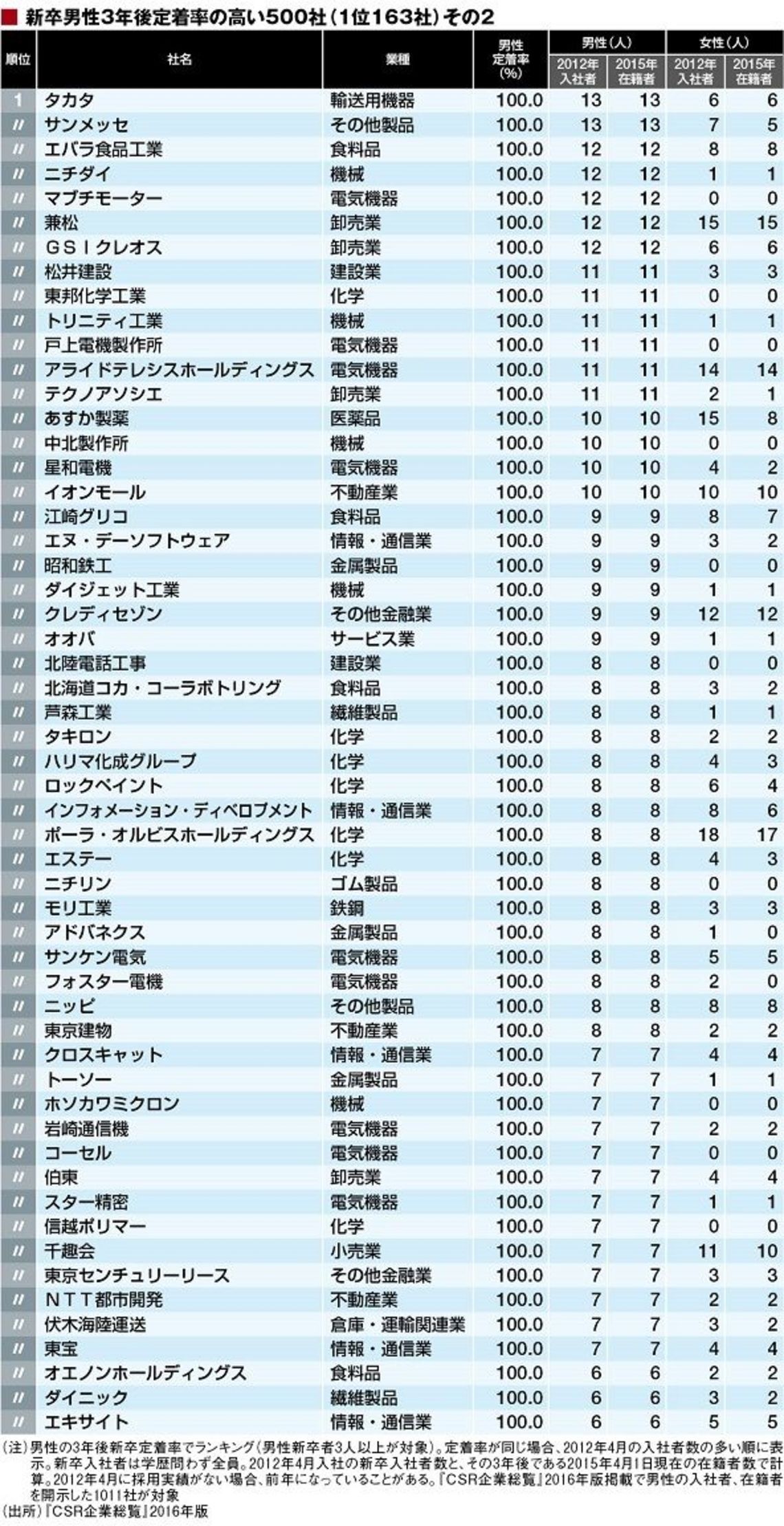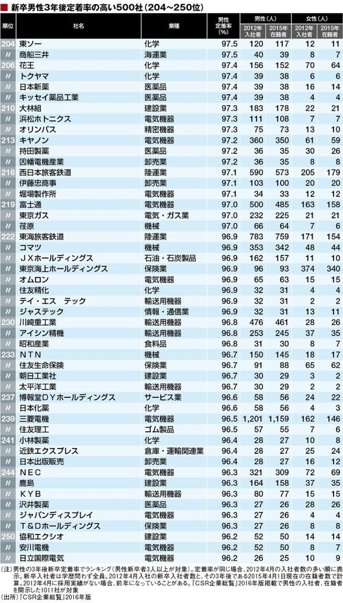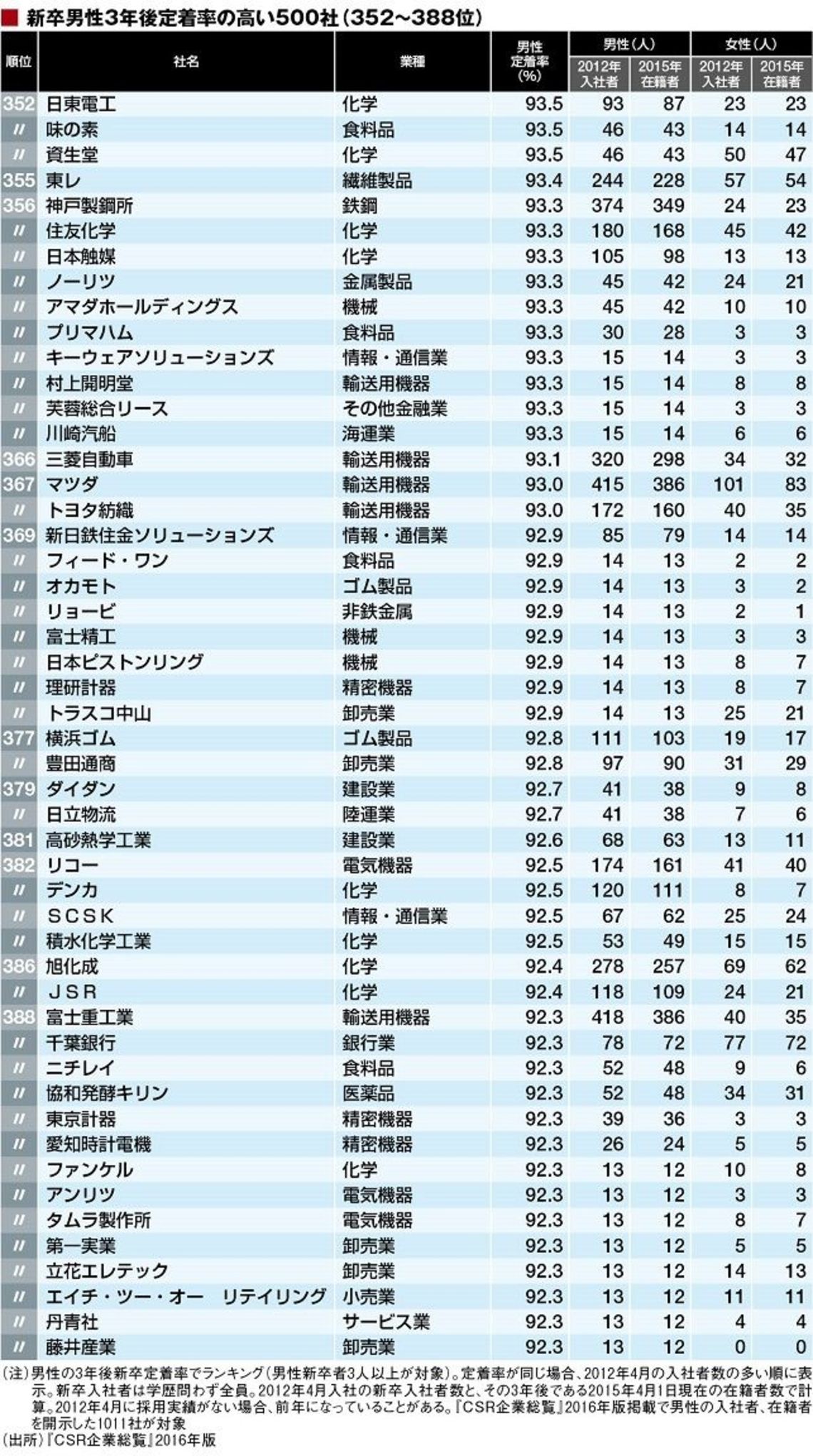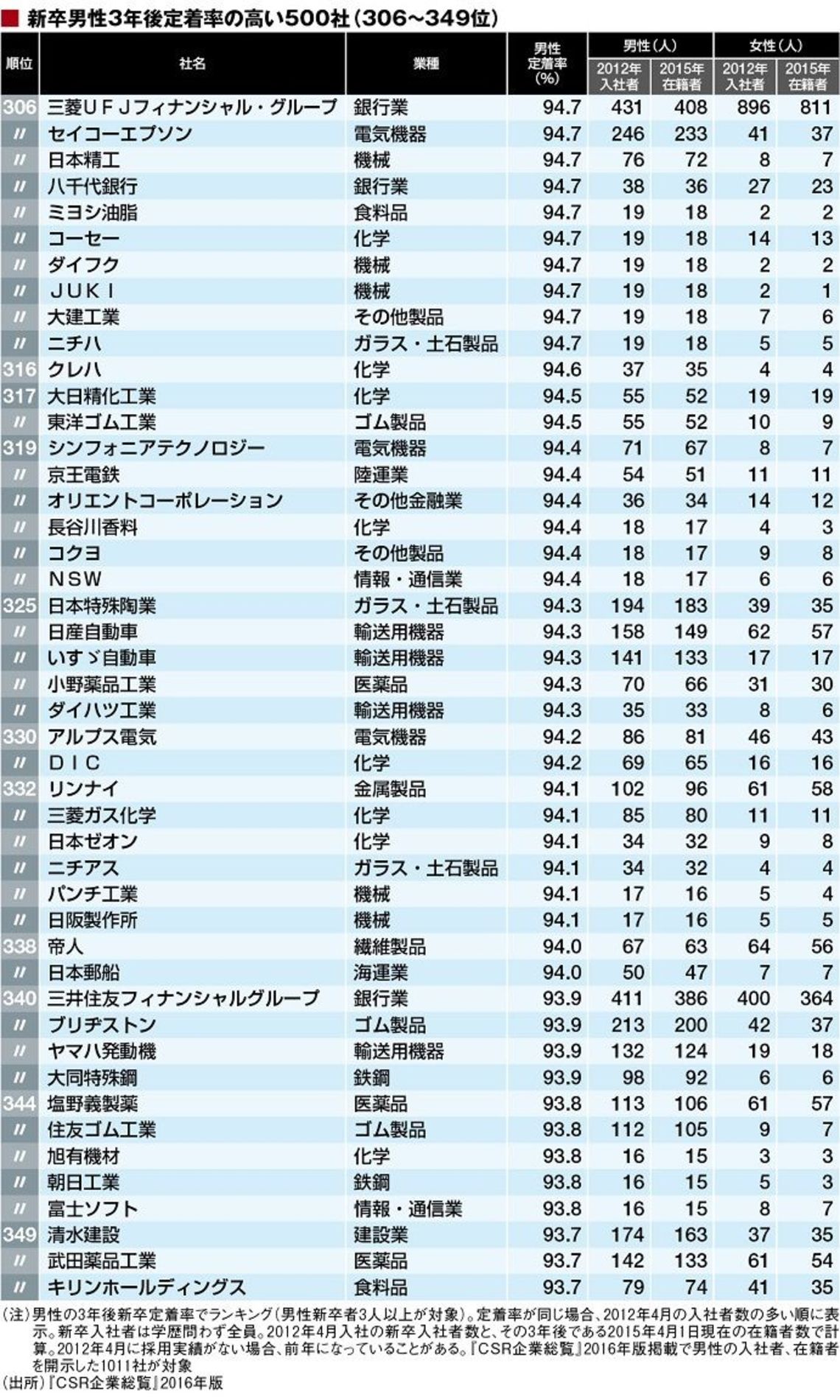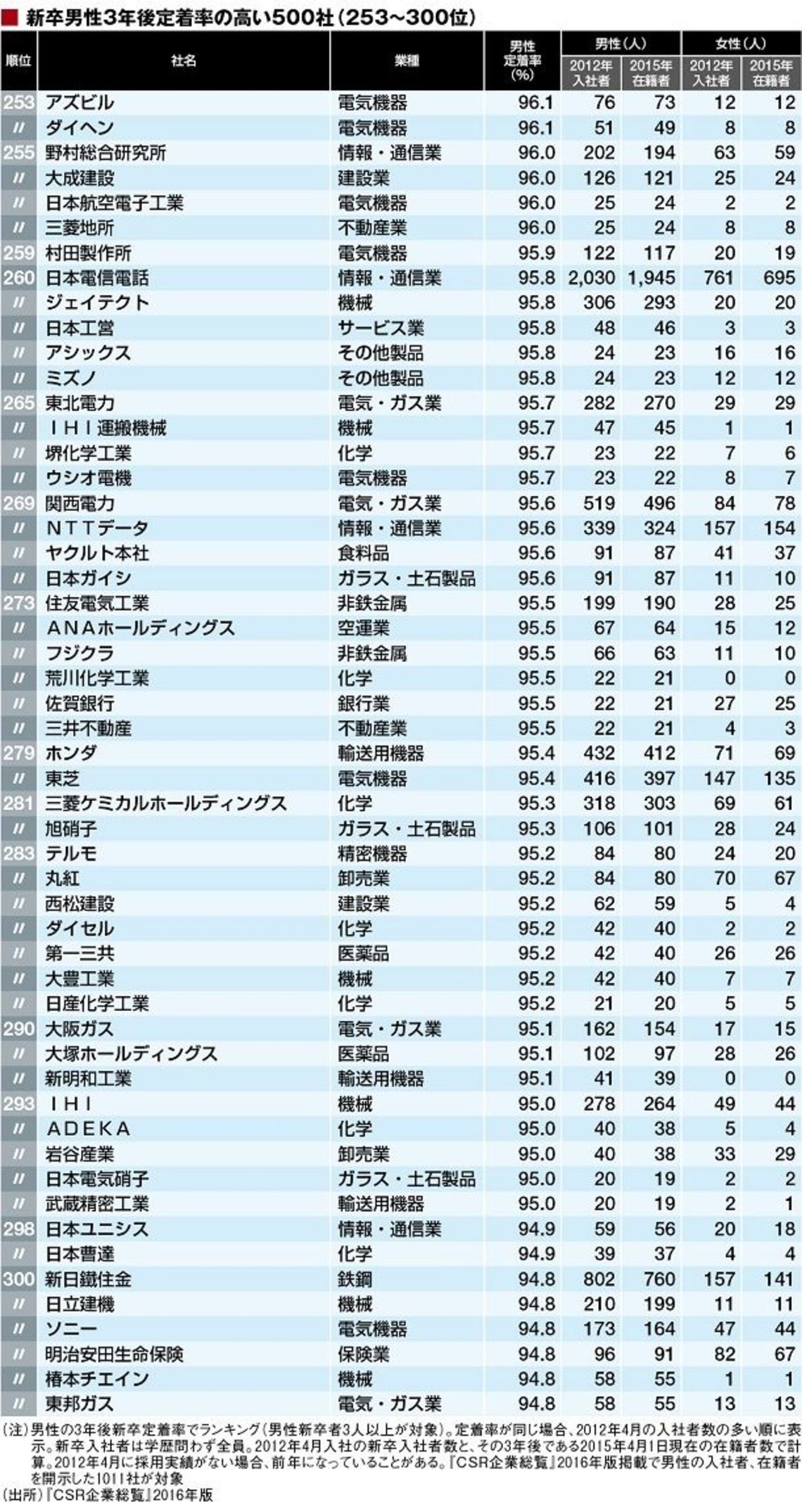 ランキングは『CSR企業総覧』2016年版で新卒男性の2012年の採用実績、3年後の2015年の在籍状況の回答があった1011社を対象に作成。このデータは大卒以外も含むことには注意していただきたい。
