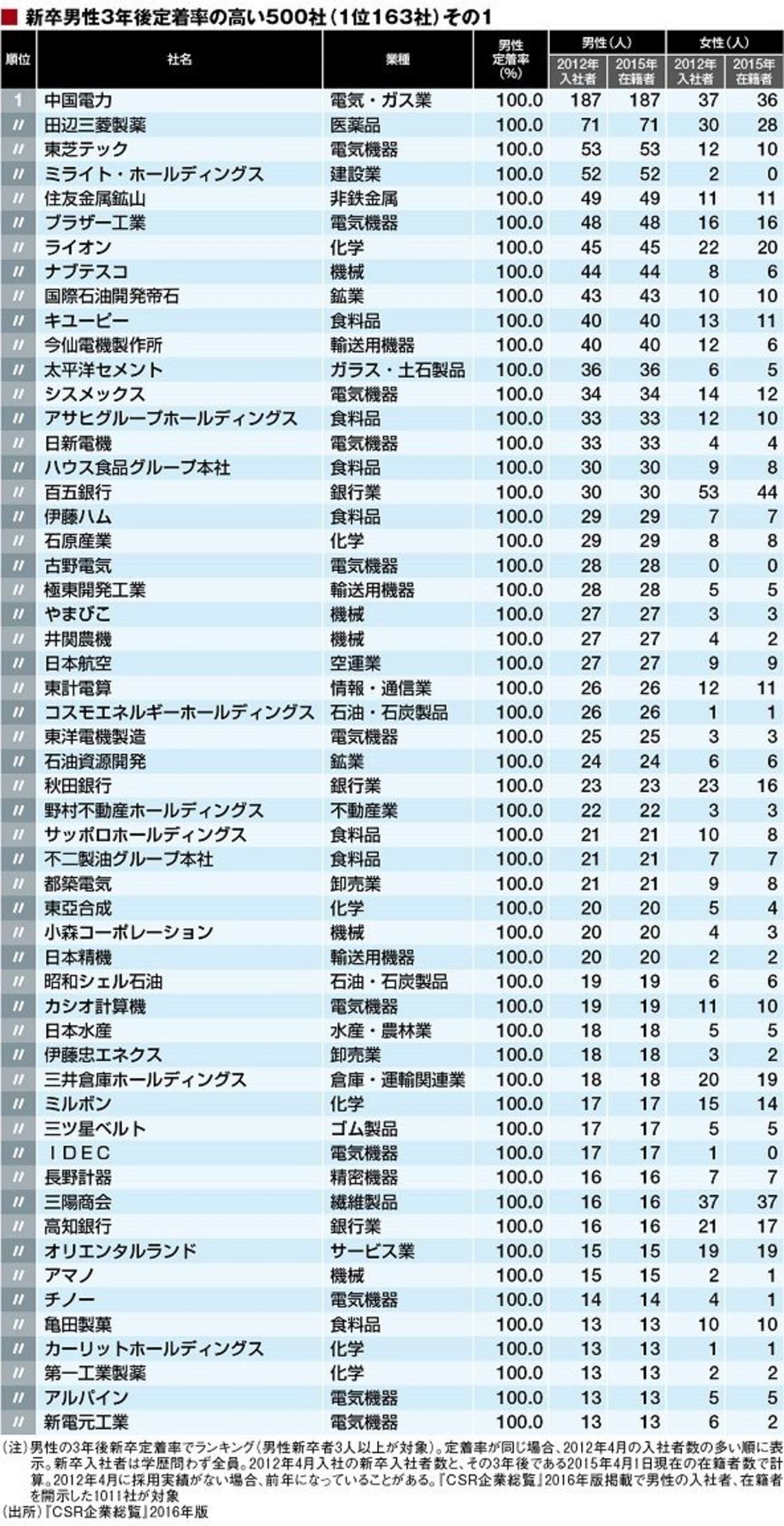 定着率100%で入社者がもっとも多かったのは中国電力の187人。『CSR企業総覧』2013年版によると2012年入社は大卒男性が76人。他は高専や高校卒業生などと考えられ、全員3年後も在籍している。ちなみに女性は37人中36人が在籍。わずか1人の離職で全体での100%はならなかった。