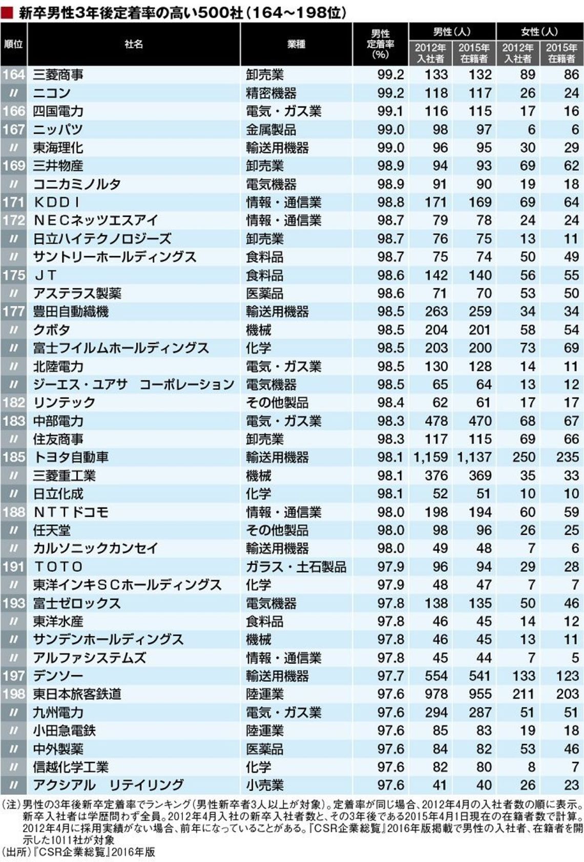 1人退職したために100%にならなかったのが99.2%で164位の三菱商事(133人→132人)とニコン(118人→117人)。採用人数が多ければ3年以内に方向転換などで数人程度が辞めることは珍しくない。100%の会社だけでなく90%台後半に優良企業が固まっているので注目してほしい。