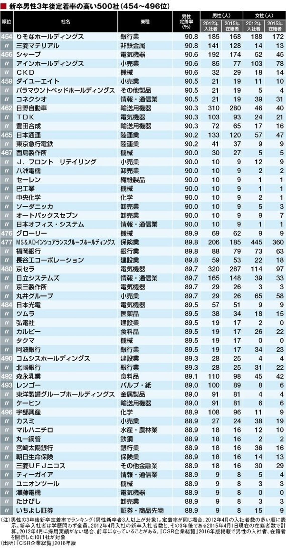 このサンデンホールディングスを含む95%以上は全部で297社、90%以上は476社ある。今回のランキングでは最下位でも88.9%と定着率の高い会社がズラリと並ぶ。