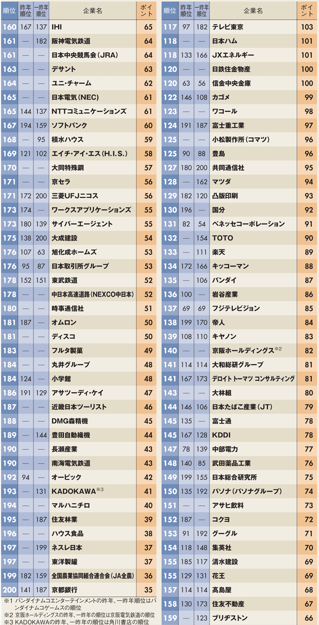 一方で大手メーカーは、サントリーグループ(11位)を筆頭に食品は健闘したが、トヨタ自動車(26位)を除いて電機・自動車はベスト50から姿を消した。非メーカーと比べて文系の採用数が少ないことに加え、入社後に自身が活躍する姿をイメージしづらいことも影響していると思われる。