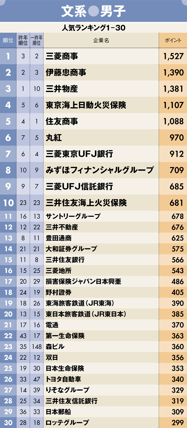 こうした環境下で39回目を迎えた就職人気企業ランキング調査は「大手志向」が継続する中、文理男女別全てのカ テゴリーで総合商社に人気が集まる結果となった。ランキング結果を基に詳しく分析していこう。