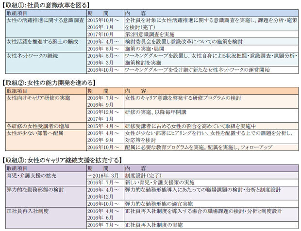 これらから抽出された課題を分析した上で、施策に反映し、女性が活躍できる雇用環境を整備する。具体的には、①社員の意識改革②女性の能力開発推進③女性のキャリア継続支援の拡充――などにより、2018年度には役職者に占める女性の比率を現状の12%から15%に引き上げる目標を掲げている。