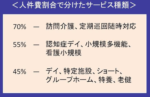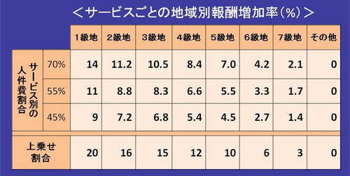 1級地は東京都の23区だけで、2級地は狛江、多摩、大阪、横浜、川崎の5市である。そして、「その他」地域に比べた上乗せ率を、1級地は20%に、2級地は16%などと定めた。次に、介護保険の各サービスを人件費割合に応じて70%、55%、45%の3グループに分けて最終的なアップ率を導き出す。