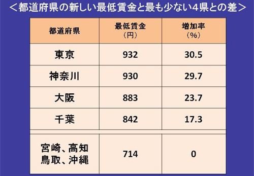 Aランク地域の東京都の最低時給は現在907円で、年内に25円アップして932円となる。これに対して最低賃金が現在693円で最も低い宮崎、高知、鳥取、沖縄の4県は、いずれもDランク地域だから21円アップして714円となる。東京都との差は現在214円、30.9%だが、改定後は218円、30.5%の差となる。